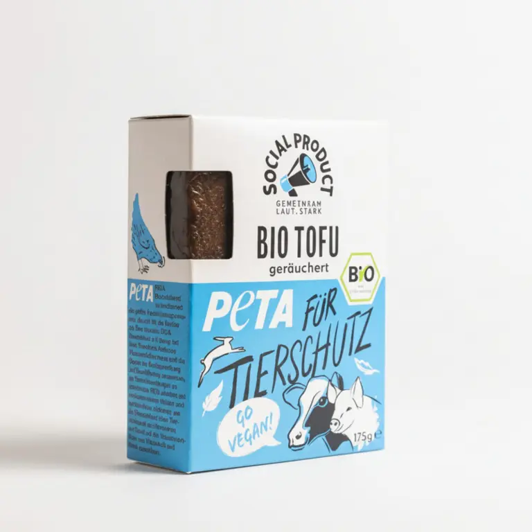 Vegan hoch zwei. Dieser bio-zertifiziertes und herzhaft über Buchenholz geräucherte Tofu wurde in Deutschland mit dem nachhaltig angebauten Donau Tofu hergestellt. Der Tofu ist Zusammenarbeit mit der international tätigen Tierschutz-Organisation PETA entstanden. Unterstützt wird PETA mit 15 Cent pro Packung für den Einsatz der Aktivist:innen für Tierschutz & Tierrrettung.
