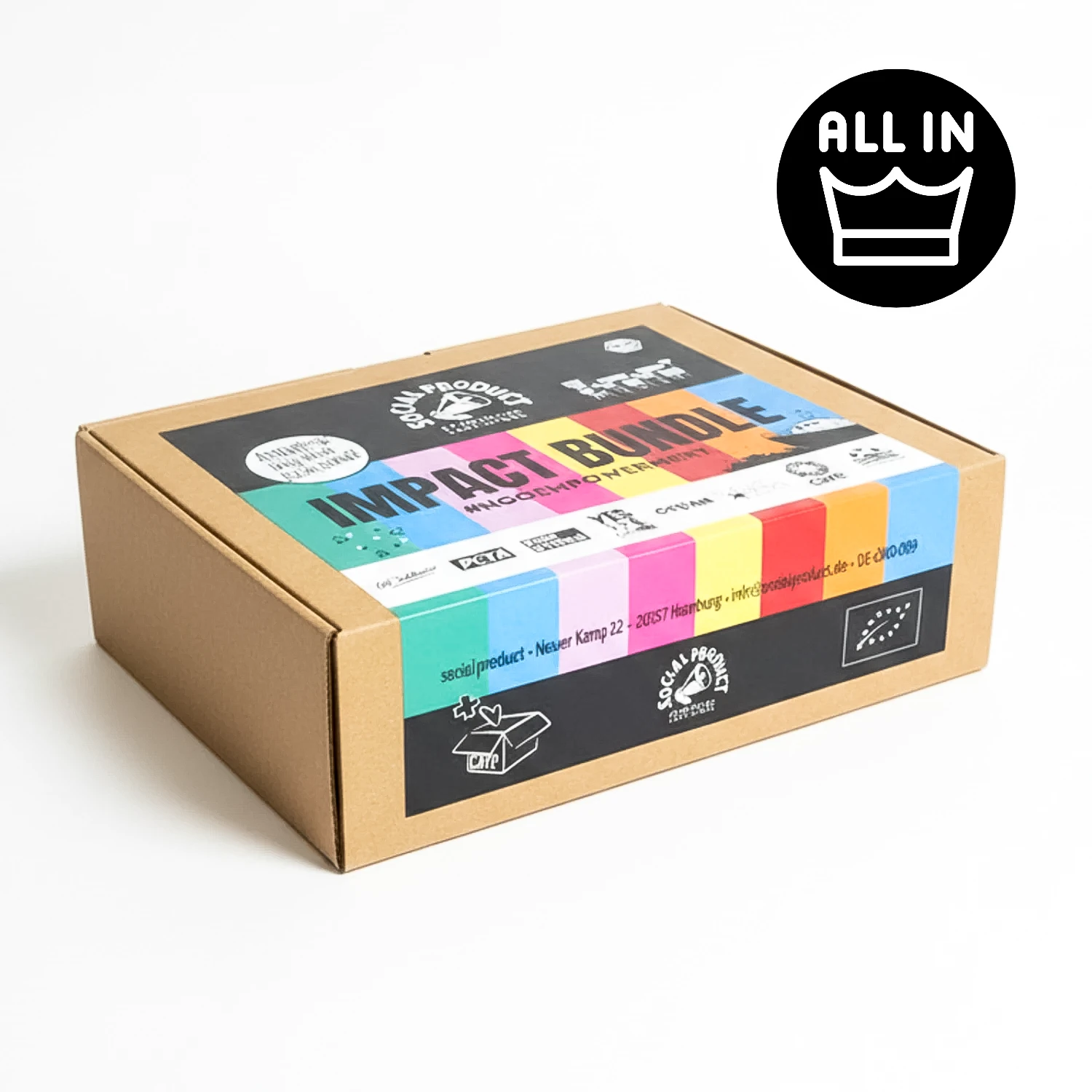 Das impact bundle x ALL IN ist das perfekte Geschenk für jeden Anlass. Mit einem Schwung verschiedene gemeinnützige Organisationen kennenlernen und gleichzeitig unterstützen war nie einfacher. Das Bundle beinhaltet die folgenden Produkte: